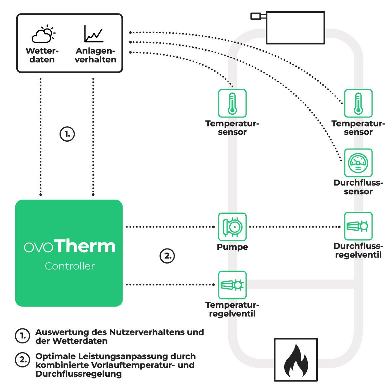 Basierend auf einer kombinierten Regelung des Durchflusses und der Vorlauftemperatur wird das Leistungsangebot optimal nach dem Low-Flow-Prinzip an den vorliegenden Lastfall angepasst. Unter Verwendung des gemessenen Verbrauchs und der aktuell vorliegenden Wetterdaten erkennt ovoTherm von selbst, in welchem Last- und Betriebszustand sich das Heizungssystem befindet. Auf Basis dieser Messdaten passt ovoTherm den Durchfluss und die Vorlauftemperatur automatisiert an. Durch diesen geschlossenen Wirkungskreis befindet sich das System immer in einem effizienten und ausgewogenen Betriebszustand.